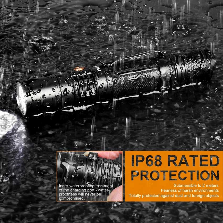 Turn the light on and off with the tactical tail switch and cycle through the six lighting modes via the newly designed metal side switch—which also has a built-in battery level indicator. You can achieve an incredible 800 hours of runtime when using the new moonlight brightness level. Compact and built-tough, the UC35 V2.0 flashlight is IP68 rated; dust proof and waterproof underwater to two meters.