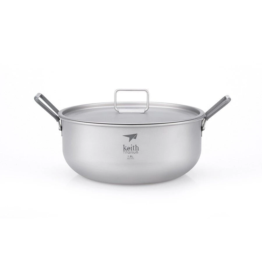 Titanium is light and strong. Handles on opposite sides of this pot allow you to easily carry it two-handed.