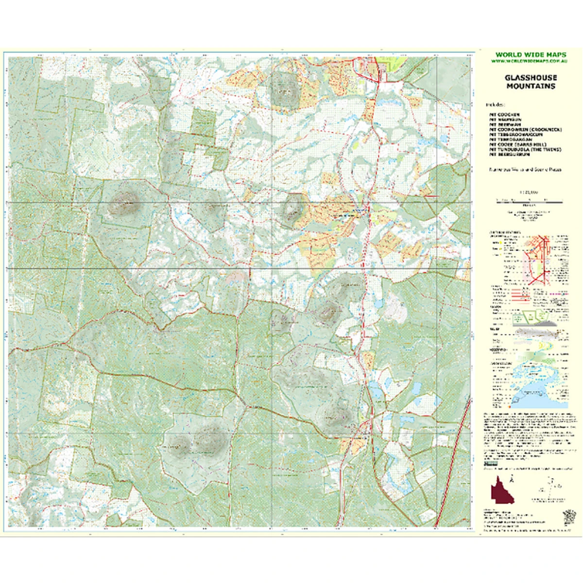 Topo map of the Glasshouse Mountains in South East Queensland at 1:25,000 scale. Includes 9 of the famous mountains:
